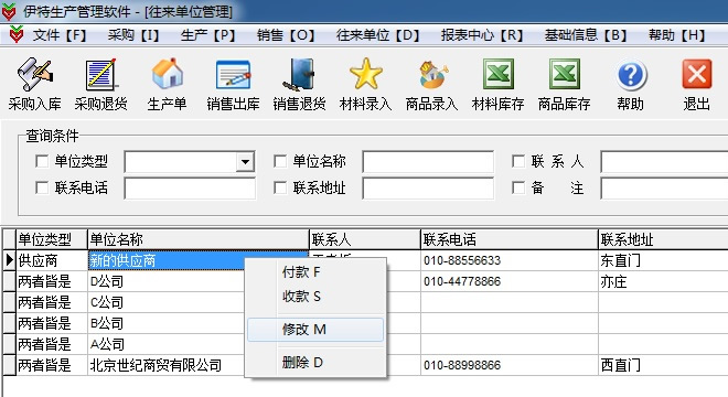 5、在“往来单位管理”窗口里选择查询条件后,单击“查询”按钮,在查询出的往来单位列表处,选中要修改的往来单位,鼠标右键选“修改”命令。